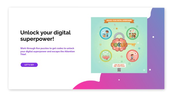 Work through five puzzles to get codes to unlock your digital superpower and escape the Attention Thief.
