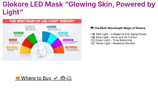 🌈 The Multi-Wavelength Magic of Glokore ⮞🔴 Red Light – Collagen & Anti-Aging Power ⮞🔵 Blue Light – Acne and Oil Control ⮞🟢 Green Light – Tone Balancing ⮞🟡 Yellow Light – Radiance Booster