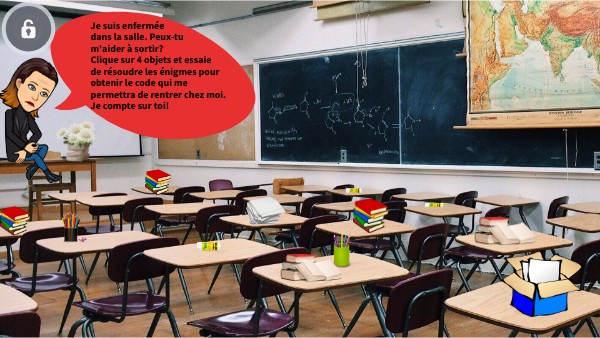 Je suis enfermée dans la salle. Peux-tu m'aider à sortir? Clique sur 4 objets et essaie de résoudre les énigmes pour obtenir le code qui me permettra de rentrer chez moi. Je compte sur toi!