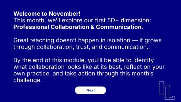 Welcome to November! This month, we’ll explore our first 5D+ dimension: Professional Collaboration & Communication. Great teaching doesn’t happen in isolation — it grows through collaboration, trust, and communication. By the end of this module, you’ll be able to identify what collaboration looks like at its best, reflect on your own practice, and take action through this month’s challenge.
