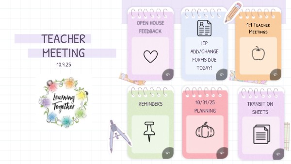- How do you communicate expectations to your TA's and 1:1's (eg: Weekly Team Meeting, Written - binder, charts, lunch schedules, etc)?