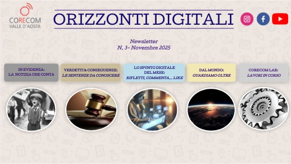 I colloqui del CoReCom Attività formative/informative a favore della popolazione dei Comuni della Valle d'Aosta. In continuità con il progetto 2023/2024 denominato "Alfabetizzazione digitale e comunicazione sociale", ideato a favore della collettività valdostana, il CoReCom Valle d'Aosta, attiva la seconda fase progettuale "I colloqui del CoReCom: comprendere il presente per vivere meglio il futuro", una serie di incontri "on demand" rivolti alla popolazione tramite singoli moduli formativi della durata di circa due ore. I Comuni interessati protranno far pevenire la loro richiesta di adesione all'indirizzo di Posta Eletronica Certificata all'indirizzo: corecomvda@legalmail.it.