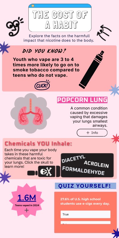 Each time you vape your body takes in these harmful chemicals that are toxic for your lungs. Click the skull to learn more!