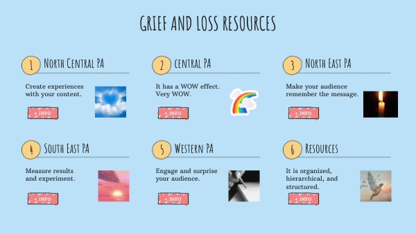• Locations include: o Williamsport o Coudersport o Wellsboro o Lock Haven o Hughesville Contact: UPMC Grief Support at 570-326-8952 website: