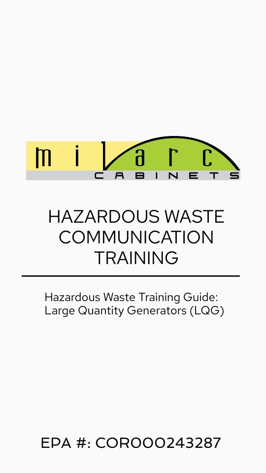 This guide provides in-depth training for Milarc Cabinets employees to ensure proper identification, handling, storage, and disposal of hazardous waste in compliance with federal (RCRA) and Colorado (CDPHE) regulations. It is designed to minimize risk to health, safety, and the environment while ensuring legal compliance during the daily operations of our custom cabinet manufacturing facility. This training document is specific to our materials, processes, and designated waste management protocols