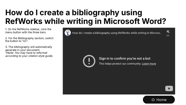 1. On the RefWorks sidebar, click the menu button with the three bars. 2. For the Bibliography section, switch the button to “on". 3. The bibliography will automatically generate in your document. *Note: You may have to reformat according to your citation style guide.