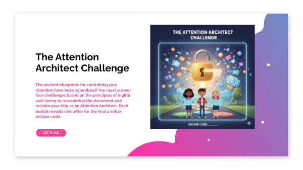 The ancient blueprints for controlling your attention have been scrambled! You must answer four challenges based on the principles of digital well-being to reassemble the document and reclaim your title as an Attention Architect. Each puzzle reveals one letter for the final 4-letter escape code.