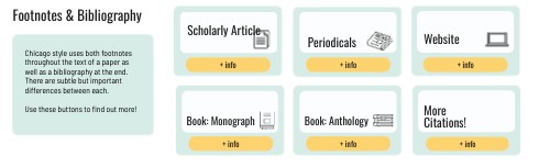 Chicago style uses both footnotes throughout the text of a paper as well as a bibliography at the end. There are subtle but important differences between each. Use these buttons to find out more!