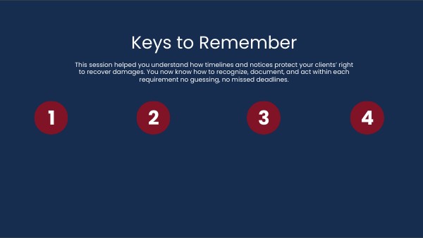 This session helped you understand how timelines and notices protect your clients’ right to recover damages. You now know how to recognize, document, and act within each requirement no guessing, no missed deadlines.
