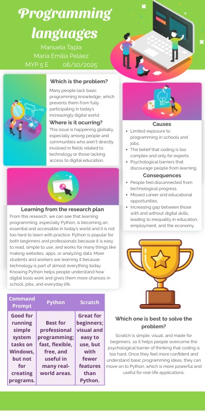 From this research, we can see that learning programming, especially Python, is becoming an essential and accessible in today’s world and it is not too hard to learn with practice. Python is popular for both beginners and professionals because it is easy to read, simple to use, and works for many things like making websites, apps, or analyzing data. More students and workers are learning it because technology is part of almost everything today. Knowing Python helps people understand how digital tools work and gives them more chances in school, jobs, and everyday life.