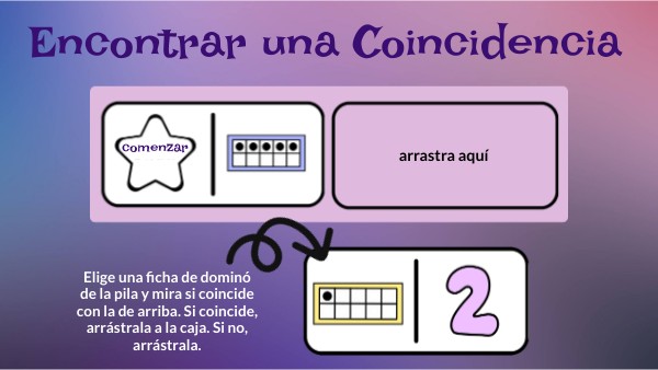 Elige una ficha de dominó de la pila y mira si coincide con la de arriba. Si coincide, arrástrala a la caja. Si no, arrástrala.