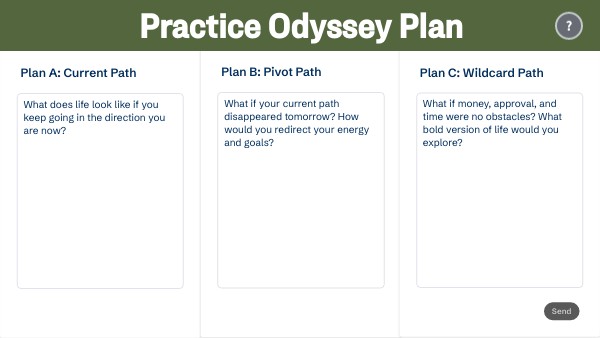 Type your responses under each plan below, then hit Send. Your answers will not be saved. This practice plan is intended to help you start to get your ideas flowing. If you would like to use what you write in your Odyssey Plan assignment, take a screenshot or copy and paste your responses into the assignment.
