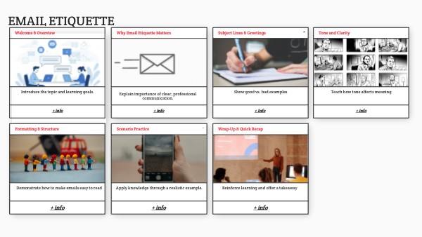 Slide 1: Welcome & Overview Title: “Welcome to Email Etiquette for Remote Teams!” Purpose: Introduce the topic and learning goals. Visuals: Background image of a laptop or virtual meeting space. Text Placeholder: Welcome! In this short module, you’ll learn how to write emails that are clear, respectful, and effective. Interactivity: Add a “Start Module” button → next slide. Audio (optional): Short narration welcoming learners.
