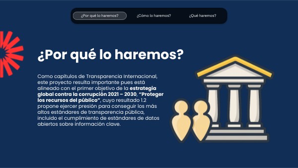 Como capítulos de Transparencia Internacional, este proyecto resulta importante pues está alineado con el primer objetivo de la estrategia global contra la corrupción 2021 – 2030, “Proteger los recursos del público”, cuyo resultado 1.2 propone ejercer presión para conseguir los más altos estándares de transparencia pública, incluido el cumplimiento de estándares de datos abiertos sobre información clave.