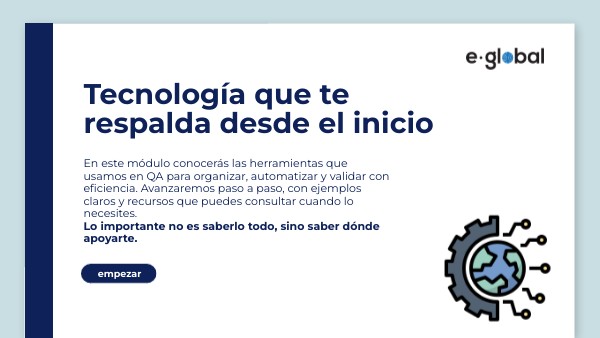En este módulo conocerás las herramientas que usamos en QA para organizar, automatizar y validar con eficiencia. Avanzaremos paso a paso, con ejemplos claros y recursos que puedes consultar cuando lo necesites. Lo importante no es saberlo todo, sino saber dónde apoyarte.