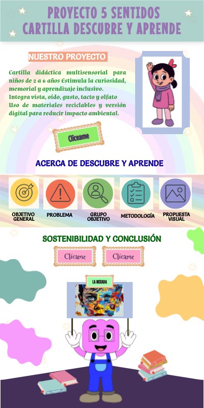 Cartilla didáctica multisensorial para niños de 2 a 6 años Estimula la curiosidad, memorial y aprendizaje inclusivo.Integra vista, oído, gusto, tacto y olfato Uso de materiales reciclables y versión digital para reducir impacto ambiental.