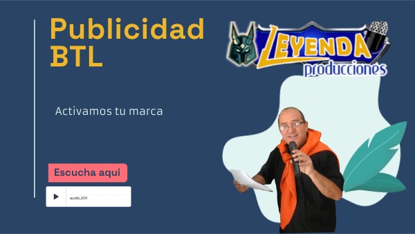 Somos una agencia de Publicidad BTL, donde activamos la marca de empresas y negocios con publicidad creativa. Ofrecemos servicios de Locución Comercial, Perifoneo, Sonido, Impulsadoras, Modelos, Logísticos, Grabación y Edición de Cuñas, Jingles, Videos, Artes Gráficas y mucho mass.