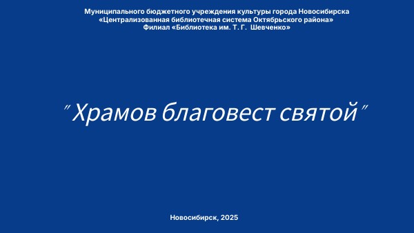 Мы рады представить вашему вниманию уникальную виртуальную выставку, посвященную величественным храмам нашего города – «Храмов благовест святой». Это путешествие в мир истории и архитектуры, где каждый камень, каждый купол хранит в себе вековые сказания. Погрузитесь в атмосферу духовности и красоты, узнайте о непростых судьбах этих святынь, восхититесь их неповторимым архитектурным обликом. Мы уверены, что история и величие новосибирских храмов не оставят вас равнодушными и подарят незабываемые впечатления.