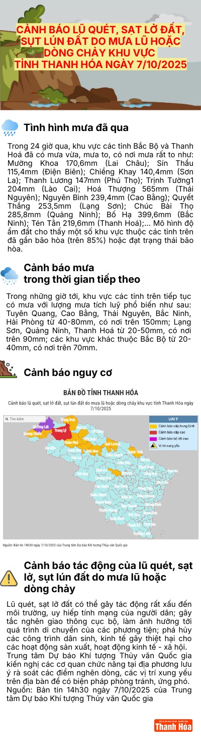 Cảnh báo lũ quét, sạt lở đất, sụt lún đất do mưa lũ hoặc dòng chảy khu vực tỉnh Thanh Hóa ngày 7/10/2025