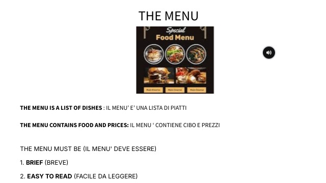 THE MENU IS A LIST OF DISHES : IL MENU’ E’ UNA LISTA DI PIATTI