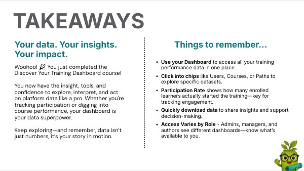 Woohoo! 🎉 You just completed the Discover Your Training Dashboard course! You now have the insight, tools, and confidence to explore, interpret, and act on platform data like a pro. Whether you're tracking participation or digging into course performance, your dashboard is your data superpower. Keep exploring—and remember, data isn’t just numbers, it’s your story in motion.