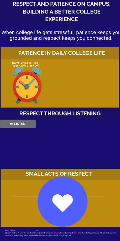 In a study of university students, Eliüşük Bülbül (2021) found that patience training increased students’ ability to stay calm, reduced stress, and improved life satisfaction.On campus, patience shows when you wait in line, handle slow technology calmly, or take a deep breath before reacting to frustration. Try pausing for one deep breath before responding when things feel stressful today.