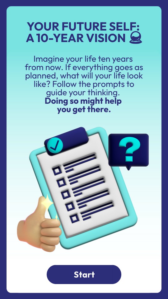 Imagine your life ten years from now. If everything goes as planned, what will your life look like? Follow the prompts to guide your thinking. Doing so might help you get there.