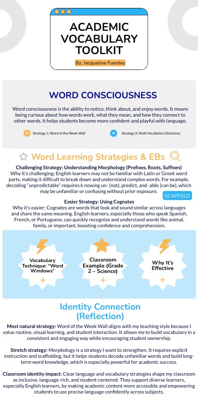 Most natural strategy: Word of the Week Wall aligns with my teaching style because I value routine, visual learning, and student interaction. It allows me to build vocabulary in a consistent and engaging way while encouraging student ownership. Stretch strategy: Morphology is a strategy I want to strengthen. It requires explicit instruction and scaffolding, but it helps students decode unfamiliar words and build long-term word knowledge, which is especially powerful for academic success. Classroom identity impact: Clear language and vocabulary strategies shape my classroom as inclusive, language-rich, and student-centered. They support diverse learners, especially English learners, by making academic content more accessible and empowering students to use precise language confidently across subjects.