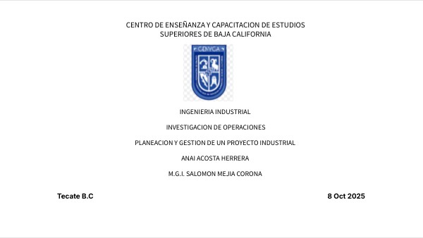 INGENIERIA INDUSTRIAL INVESTIGACION DE OPERACIONES PLANEACION Y GESTION DE UN PROYECTO INDUSTRIAL ANAI ACOSTA HERRERA M.G.I. SALOMON MEJIA CORONA