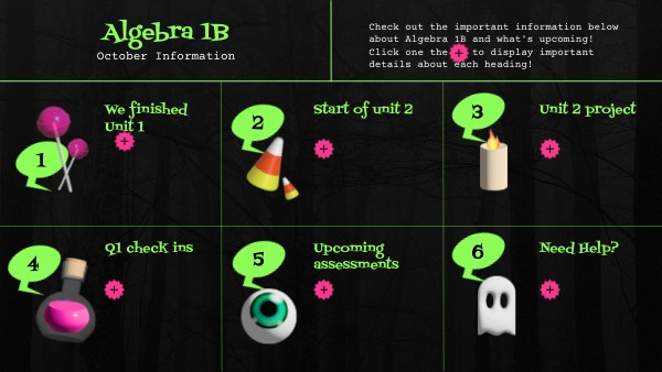 Check out the important information below about Algebra 1B and what's upcoming! Click one the to display important details about each heading!