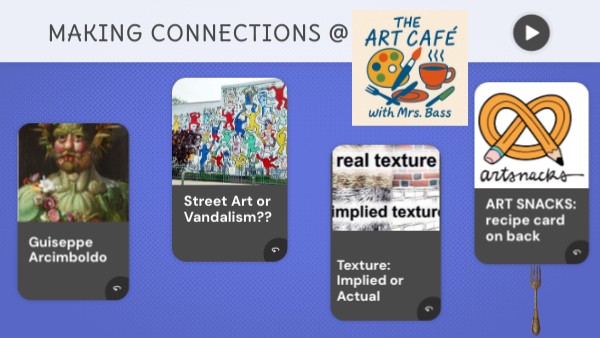 Click on each image to get a sneak peek of your DBA with Mrs. Bass. Create a MINI example of implied texture as the texture card states. (Feel free to also bring a food snack, this is optional, but Mrs. Bass will have a snack during the DBA)