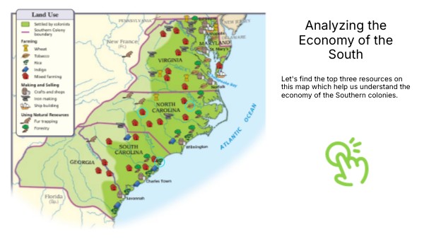 Let's find the top three resources on this map which help us understand the economy of the Southern colonies.