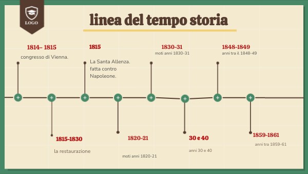 Le guerre d'indipendenza italiane, guidate dal Regno di Sardegna (con Cavour) e dal movimento mazziniano (con Garibaldi), portano alla proclamazione del Regno d'Italia.