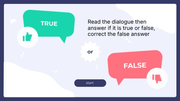 Read the dialogue then answer if it is true or false, correct the false answer