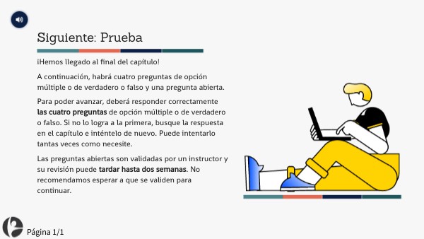 Para poder avanzar, deberá responder correctamente las cuatro preguntas de opción múltiple o de verdadero o falso. Si no lo logra a la primera, busque la respuesta en el capítulo e inténtelo de nuevo. Puede intentarlo tantas veces como necesite.