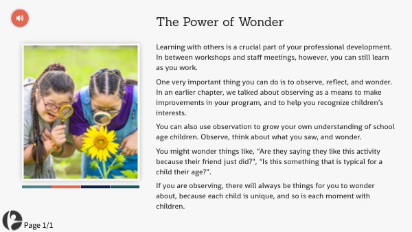 Aprender con otras personas es una parte crucial de su desarrollo profesional. Sin embargo, entre talleres y reuniones del personal, también puede seguir aprendiendo mientras trabaja. Algo muy importante que puede hacer es observar, reflexionar y hacerse preguntas. En un capítulo anterior, hablamos de la observación como un medio para mejorar su programa y para ayudarle a reconocer los intereses de los niños. También puede usar la observación para ampliar su comprensión de los niños en edad escolar. Observe, piense en lo que vio y formule preguntas. Puede preguntarse cosas como: “¿Dicen que les gusta esta actividad porque su amigo la hizo antes?” o “¿Esto es algo típico en un niño de su edad?”. Si está observando, siempre habrá algo sobre lo que hacerse preguntas, porque cada niño es único y cada momento con ellos también lo es.