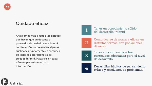Analicemos más a fondo los detalles que hacen que un docente o proveedor de cuidado sea eficaz. A continuación, se presentan algunas cualidades fundamentales comunes en todos los profesionales del cuidado infantil. Haga clic en cada número para obtener más información.