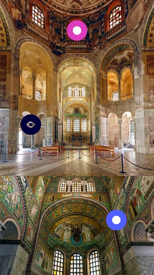 This image depicts the inside of the San Vitale Basilica. The architecture of this basilica is a very interesting aspect as it combines multiple different styles. The building has an octagonal plan that includes a central dome area with radiating chapels formed by excedre. This dome is carried using squinch, which is traditional in Arab architecture, these release pressure from the big dome on top. This building also has an ambulatory which means that you can walk around the exterior of the entire building. The architecture also has two floors which represents a divide in gender. You can also see, along the bottom of the dome, there is a tambor which has windows underneath. You can also see references of other big churches in the building architecture that would have helped relate power to Justinan and the bishop. The exterior also includes references to multiple different styles.