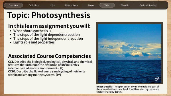 CC1. Describe the biological, geological, physical, and chemical features that influence the evolution of life in Earth’s interconnected marine environments. (I) CC10. Describe the flow of energy and cycling of nutrients within and among marine systems. (IV)