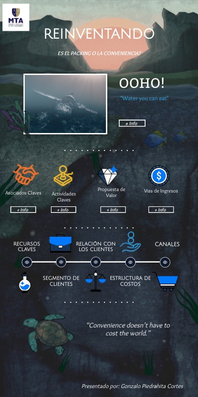 🏃♂️ Organizadores de eventos deportivos y culturalesMaratones, conciertos, ferias y festivales que buscan reducir su huella ambiental🥤 Empresas de bebidas y alimentación sosteniblesMarcas como Tropicana, Glenlivet o Unilever usan Ooho/Notpla en campañas, degustaciones o envases biodegradables.🍽️Hoteles, restaurantes y plataformas como Just Eat integran envases Notpla (salsas, cápsulas, cajas compostables) para ofrecer experiencias eco-friendly y reducir residuos posconsumo.🌿 Consumidores ecológicos Público general eco-consciente interesado en probar o fabricar sus propios Oohos. 🏛️ Organismos gubernamentales y ONGsMunicipios y organizaciones enfocadas en sostenibilidad o acceso al agua, con potencial para aplicar Ooho en eventos públicos o programas humanitarios, aprovechando su bajo costo y producción local.