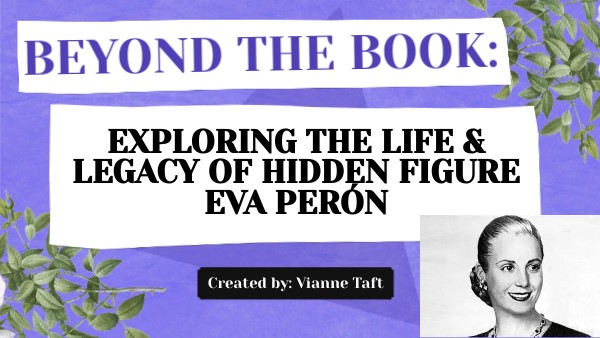 I chose to complete my Beyond the Book assignment on the hidden figure Eva Perón due to her inspiring work in addressing societal issues, such as gender inequality and women's political rights in Argentina. Eva's dedication to equality and social justice can inspire middle school students to reflect on similar challenges that exist in their own communities. Students will likely not read about women like Eva Perón in their textbook, making this lesson even more important to their diversify their knowledge. Studying who Eva Perón was and the impact she made can empower students to become changemakers themselves. Because issues like gender inequality and social injustice remain relevant today, exploring her story offers meaningful opportunities for students to connect past struggles to the ongoing pursuit of fairness and equality.