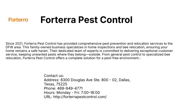 Since 2021, Forterra Pest Control has provided comprehensive pest prevention and relocation services to the DFW area. This family-owned business specializes in home inspections and bee relocation, ensuring your home remains a safe haven. Their dedicated team of experts is committed to delivering exceptional customer service, keeping unwanted pests where they belong—outside. From general pest control to specialized bee relocation, Forterra Pest Control offers a complete solution for a pest-free environment.-