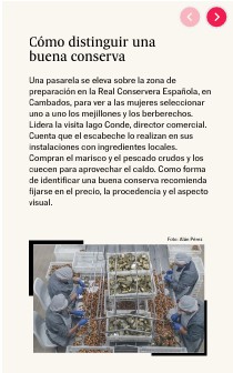 Una pasarela se eleva sobre la zona de preparación en la Real Conservera Española, en Cambados, para ver a las mujeres seleccionar uno a uno los mejillones y los berberechos. Lidera la visita Iago Conde, director comercial. Cuenta que el escabeche lo realizan en sus instalaciones con ingredientes locales. Compran el marisco y el pescado crudos y los cuecen para aprovechar el caldo. Como forma de identificar una buena conserva recomienda fijarse en el precio, la procedencia y el aspecto visual.