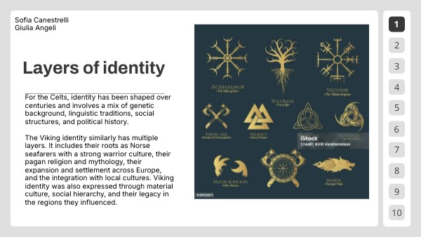 For the Celts, identity has been shaped over centuries and involves a mix of genetic background, linguistic traditions, social structures, and political history. The Viking identity similarly has multiple layers. It includes their roots as Norse seafarers with a strong warrior culture, their pagan religion and mythology, their expansion and settlement across Europe, and the integration with local cultures. Viking identity was also expressed through material culture, social hierarchy, and their legacy in the regions they influenced.