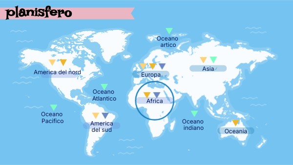 Deserto 🏜️ → Nel Nord (Sahara) e nel Sud-Ovest (Namib e Kalahari). Savana 🌾 → Nella zona centrale e orientale, tra il deserto e la foresta pluviale. Foresta equatoriali 🌳 → Nel bacino del Congo, nell’Africa centrale. Macchia mediterranea 🌿 → Lungo le coste del Nord Africa che si affacciano sul Mar Mediterraneo.
