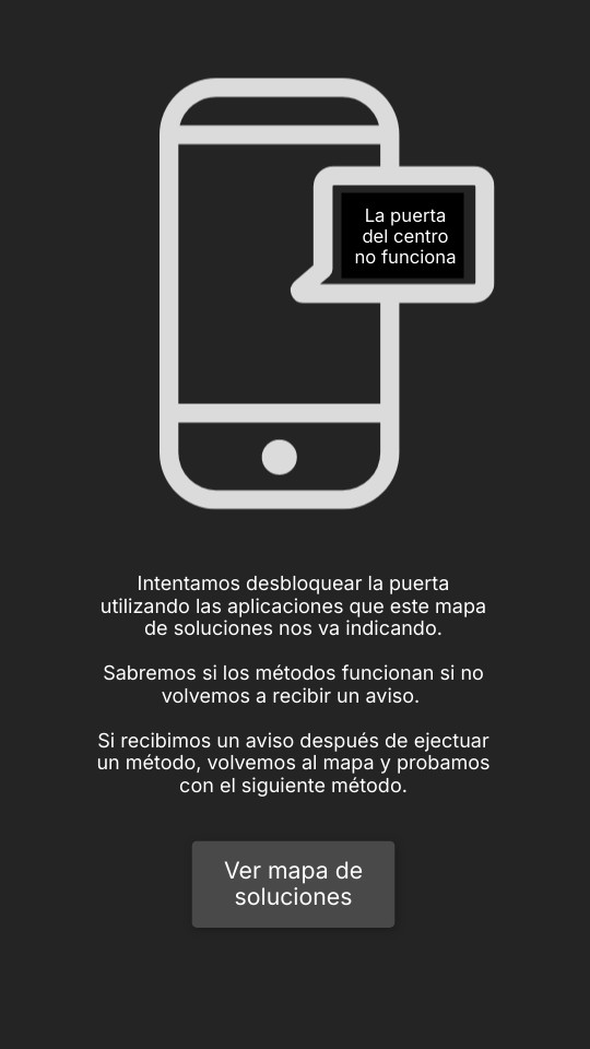 Intentamos desbloquear la puerta utilizando las aplicaciones que este mapa de soluciones nos va indicando. Sabremos si los métodos funcionan si no volvemos a recibir un aviso. Si recibimos un aviso después de ejectuar un método, volvemos al mapa y probamos con el siguiente método.