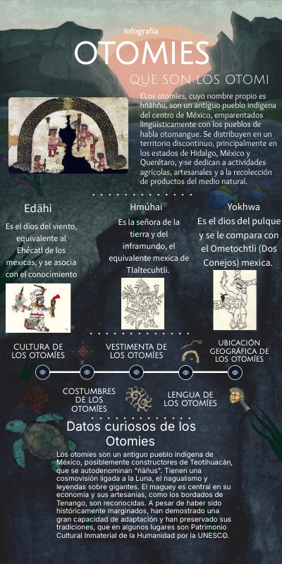 Los otomíes son un antiguo pueblo indígena de México, posiblemente constructores de Teotihuacán, que se autodenominan "ñäñus". Tienen una cosmovisión ligada a la Luna, el nagualismo y leyendas sobre gigantes. El maguey es central en su economía y sus artesanías, como los bordados de Tenango, son reconocidas. A pesar de haber sido históricamente marginados, han demostrado una gran capacidad de adaptación y han preservado sus tradiciones, que en algunos lugares son Patrimonio Cultural Inmaterial de la Humanidad por la UNESCO.