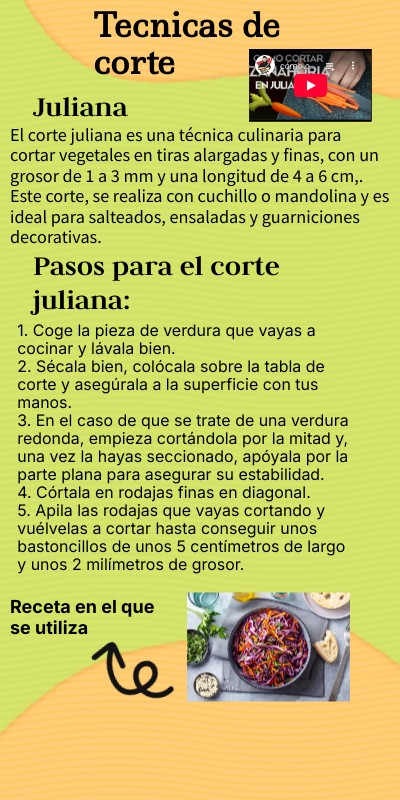 El corte juliana es una técnica culinaria para cortar vegetales en tiras alargadas y finas, con un grosor de 1 a 3 mm y una longitud de 4 a 6 cm,. Este corte, se realiza con cuchillo o mandolina y es ideal para salteados, ensaladas y guarniciones decorativas.