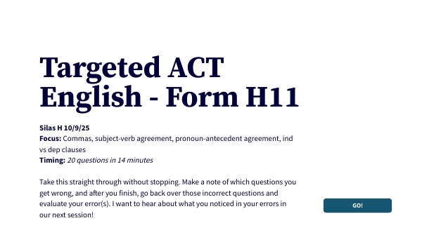 Silas H 10/9/25 Focus: Commas, subject-verb agreement, pronoun-antecedent agreement, ind vs dep clauses Timing: 20 questions in 14 minutes Take this straight through without stopping. Make a note of which questions you get wrong, and after you finish, go back over those incorrect questions and evaluate your error(s). I want to hear about what you noticed in your errors in our next session!