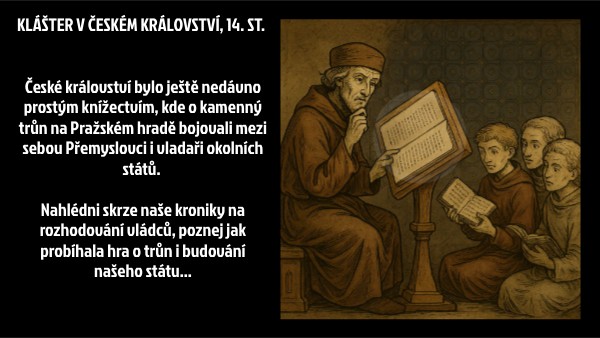 České království bylo ještě nedávno prostým knížectvím, kde o kamenný trůn na Pražském hradě bojovali mezi sebou Přemyslovci i vladaři okolních států. Nahlédni skrze naše kroniky na rozhodování vládců, poznej jak probíhala hra o trůn i budování našeho státu...